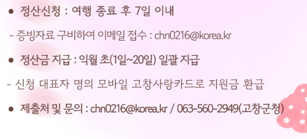 - 숙박 조건: 최소 1박 이상 고창 지역 내 숙박 필수 (숙박비의 50%만 인정)