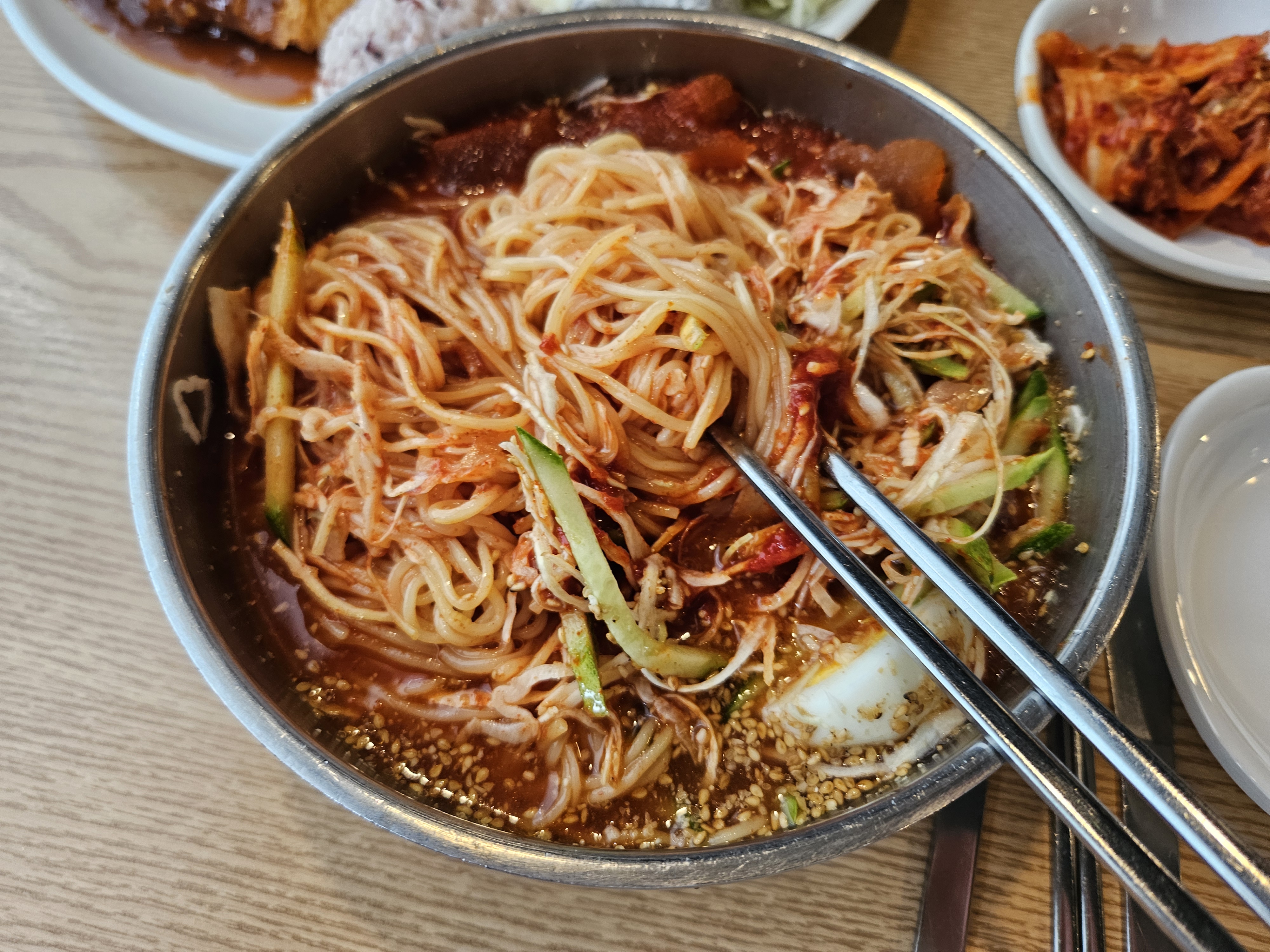뚱보아저씨의 또 다른 인기 메뉴는 바로 국수입니다. 특히 물비빔국수는 살얼음 육수가 들어가 정말 시원하고, 면은 쫄면처럼 탱탱한 식감이 일품입니다. 오이와 양배추 덕분에 아삭한 식감도 즐길 수 있어요. 이 물비빔국수 덕분에 큰 돈까스를 다 먹어도 끝에 느끼하지 않게 마무리할 수 있습니다.