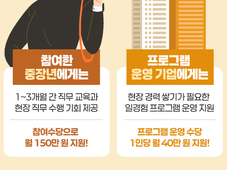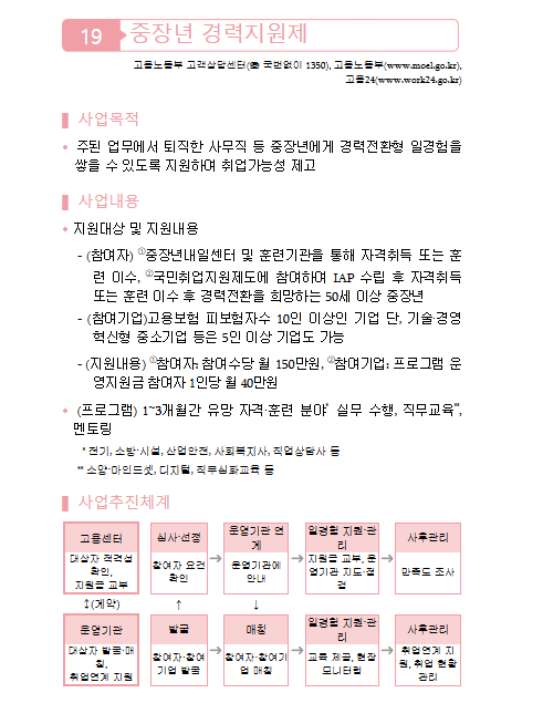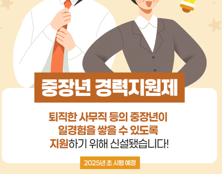 중장년 경력 지원제는 50대 이상 퇴직자들이 새로운 직종에서 일할 수 있도록 도와주는 제도입니다. 쉽게 말해서 오랫동안 사무직으로 일하다가 퇴직한 분들이 전기 기사나 사회복지사 같은 새로운 일을 배우고 실제로 경험할 수 있게 해주는 프로그램입니다.