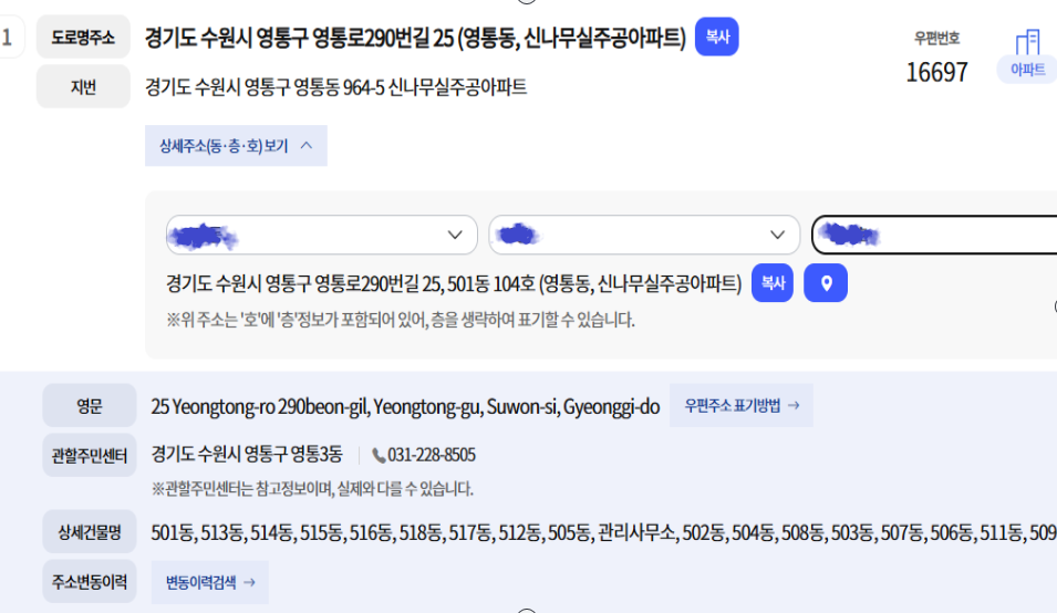 클릭하시고 주소 검색하시면 아래 그림처럼 관할 주민센터와 전화번호가 확인됩니다.
